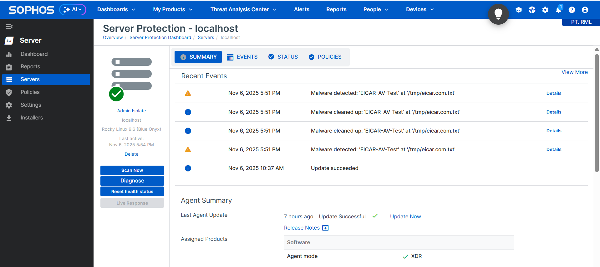 Kita cek dan verifikasi pada status host Rocky Linux di console portal Sophos Central pada screenshot dibawah dapat kita lihat bahwa agent AV mampu deteksi dan otomatis lakukan clean-up dengan cara delete file EICAR.