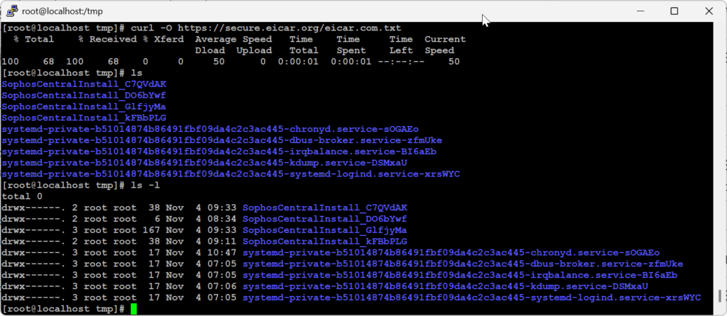 Pada screenshot dibawah perintah curl sukses download file EICAR, tapi kemudian dicek dengan perintah ‘ls’ tidak terdapat file EICAR.