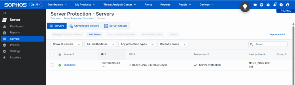 Sophos tidak secara resmi menyatakan dukungan untuk Rocky Linux, jadi proses ini dilakukan atas tanggung jawab pengguna. Namun dari sisi teknis, agen berjalan normal pada kernel dan library bawaan Rocky Linux 9.6.